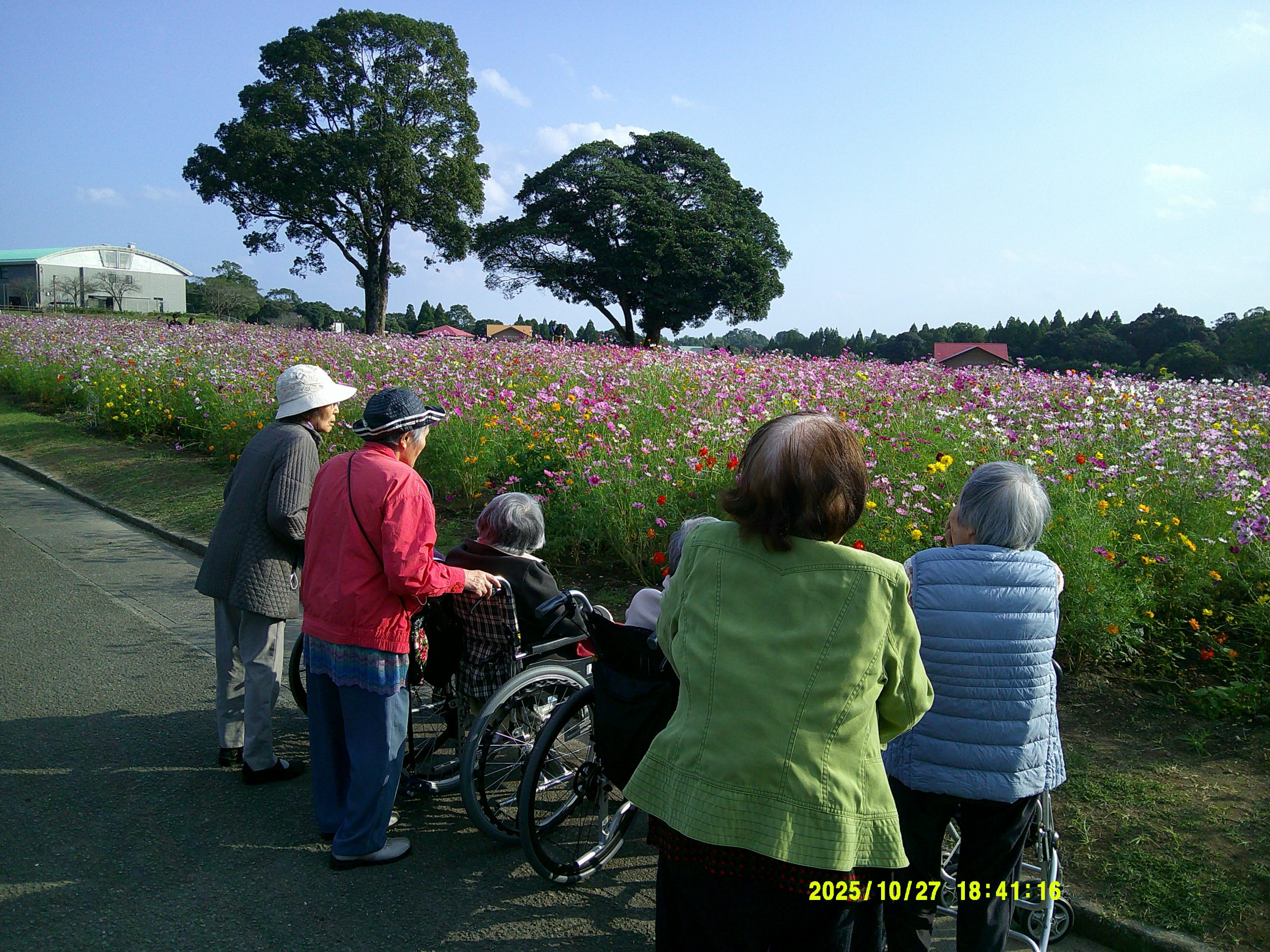 秋空が広がる中、優しい風にふかれてコスモスが咲いています。