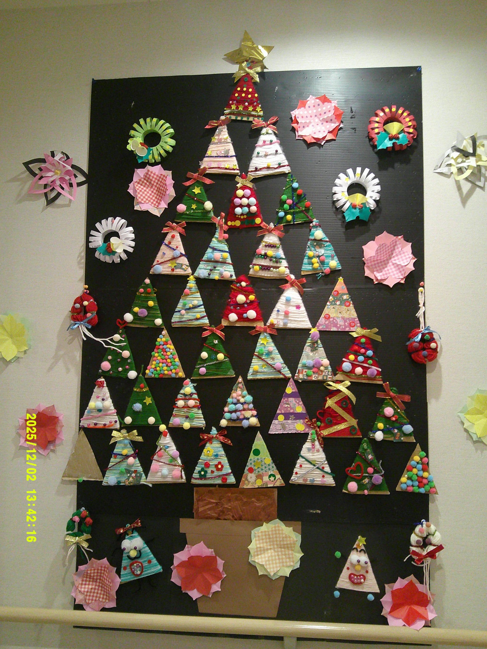 ご利用者様が毛糸を巻き付けたりリボンを付けたりして作成したクリスマスツリーを見て